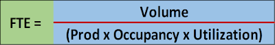 There is also another factor in the denominator that sinks up with our volume. If we are using ‘weekly’ volume, then we would have a factor of 40 hours in the denominator – assuming that 1 FTE works 40 hours of regular shift time during a week. Utilization is the inverse of ‘shrinkage,’ which we will discuss later.