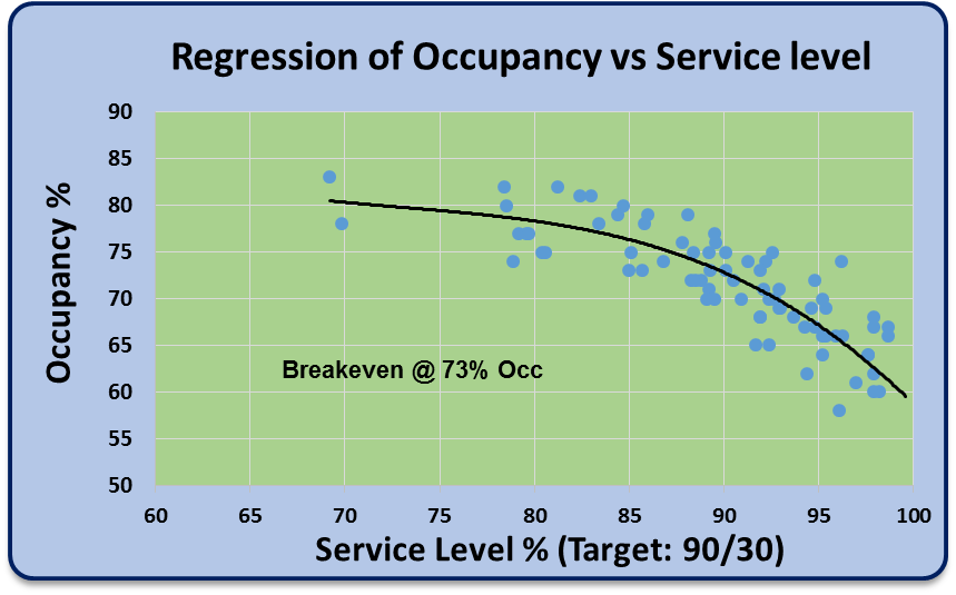 The Erlang formulas try to help us quantify the variability in the process and tell us what our occupancy will be in order to meet SL’s. Figuring out our ‘true’ occupancy at Service Level is the ‘Holy Grail’ in this entire process. Variability is the enemy. The more variability we have, the less efficient we will be and it will drive down our occupancy and increase our staffing. Refer to the ‘professionally’ modeled graph below: