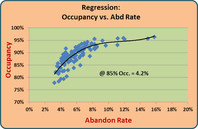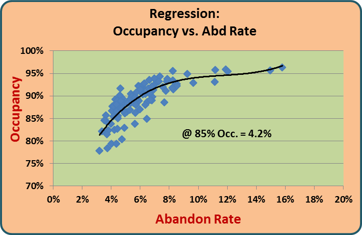 So how do I figure out the correct number of abandons to subtract from my offered call volume forecast? Here is another scatter plot trick that you can build from your ACD data. The two variables that you want to plot against each other are ‘Daily abandon rate’ and ‘Daily occupancy rate.’