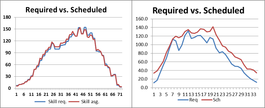 The two graphs below show the ‘optimal’ results from two different scheduling tools. Do you think that one would be more efficient than the other? Clearly.